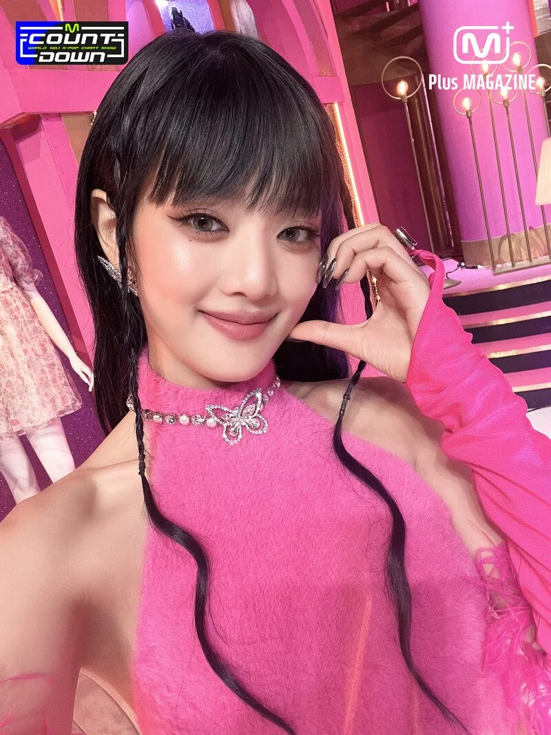Minnie wears the Joomi Lim pink rhinestone “Mariposa Necklace” in (G)-Idle’s “Queencard” Performance Music Video